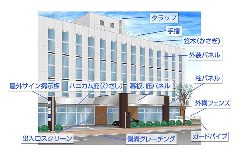 ▪ タラップ ▪ 手摺 ▪ 笠木(かさぎ) ▪ 外装パネル ▪ 屋外サイン掲示板 ▪ ハニカム庇(ひさし) ▪ 出入口スクリーン ▪ 幕板、庇パネル ▪ 柱パネル ▪ 外構フェンス ▪ ガードパイプ ▪ 側溝グレーチング