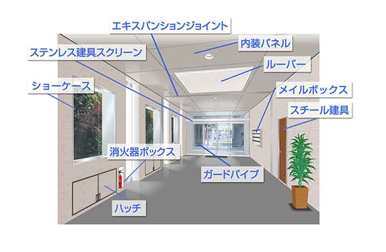 ▪ タラップ ▪ ルーバー ▪ 内装パネル ▪ エキスパンションジョイント ▪ ステンレス建具スクリーン ▪ ショーケース ▪ メイルボックス ▪ スチール建具 ▪ ガードパイプ ▪ 消火器ボックス ▪ ハッチ